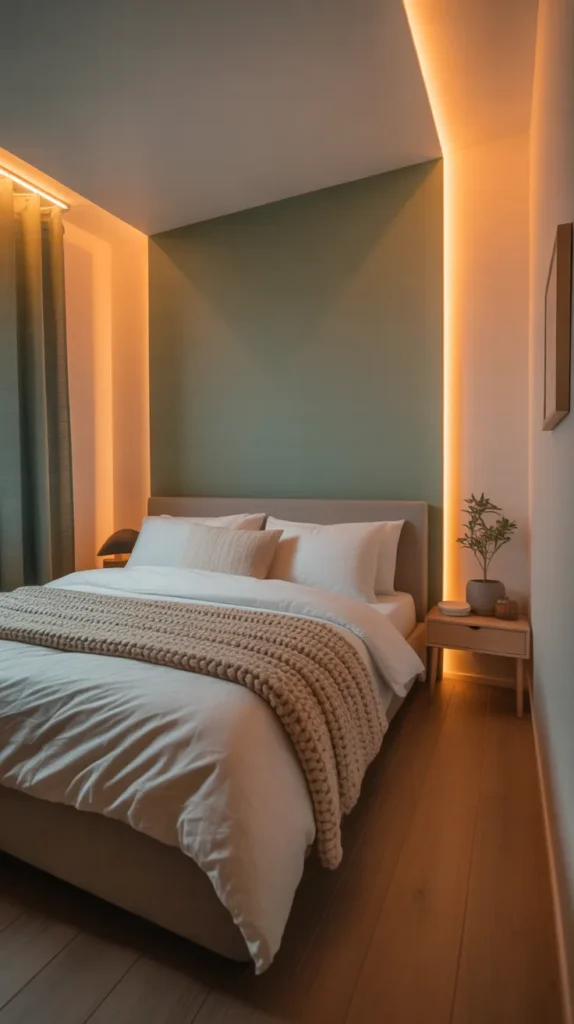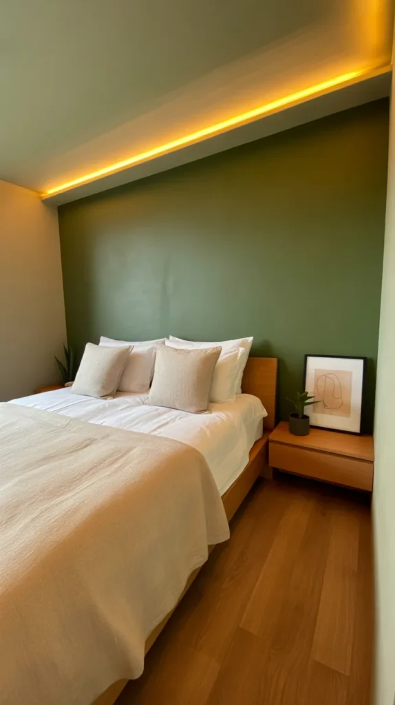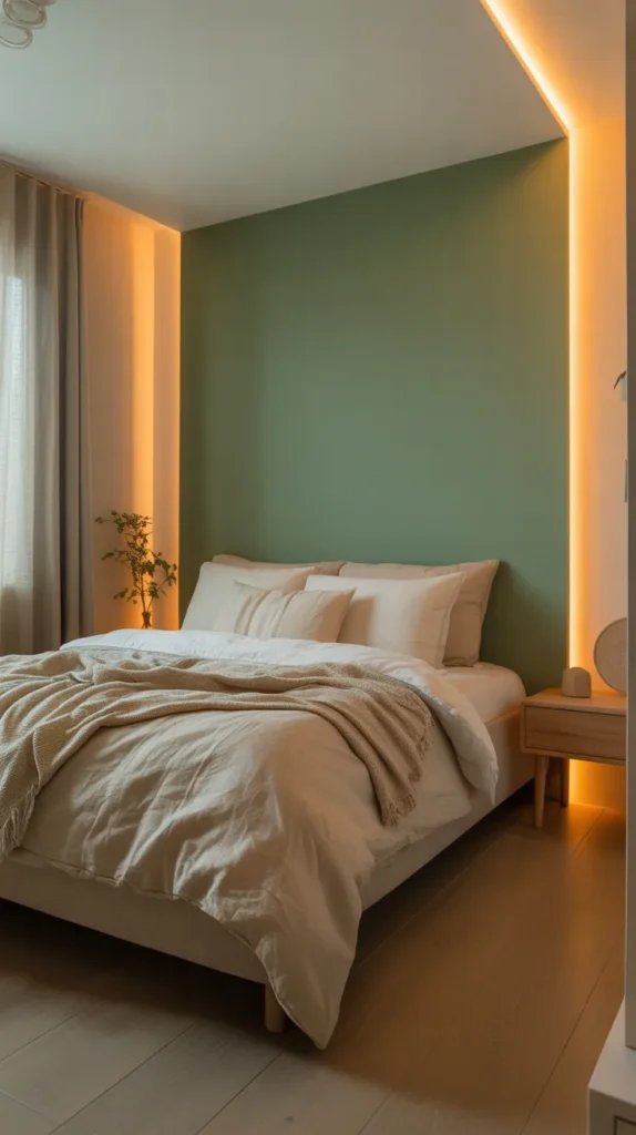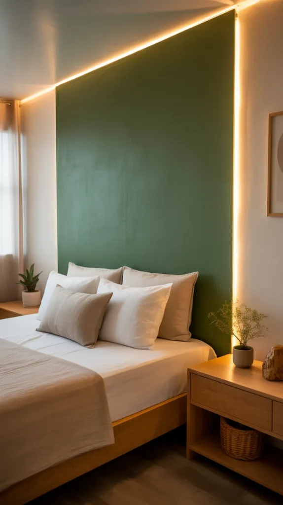 Choose sage green, blush, or muted grey for the accent wall. Add warm strip lighting, pendant lamps, or fairy lights.