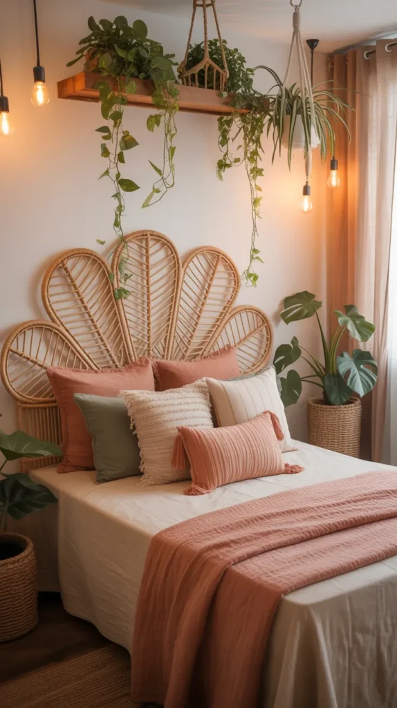 Layer earthy tones, rattan furniture, macramé wall art, and cozy throws. Include hanging plants and floor cushions for a laid-back vibe.