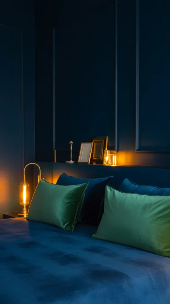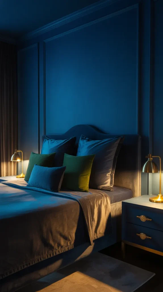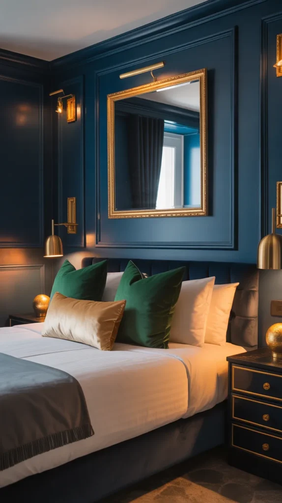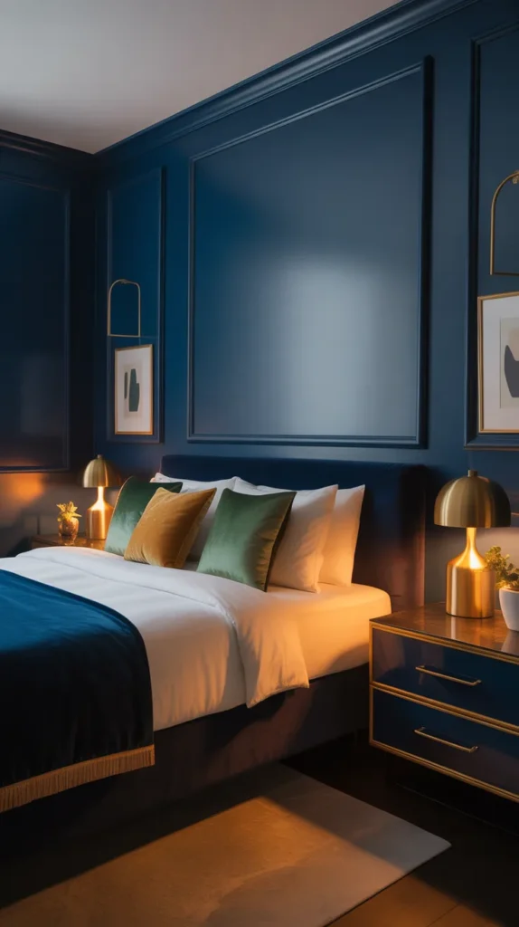 Rich navy, charcoal, or forest green walls add depth and luxury to compact spaces. Combine with warm gold accents, minimal furniture, and soft lighting. This design suits small room makeover aesthetics where mood and comfort matter.