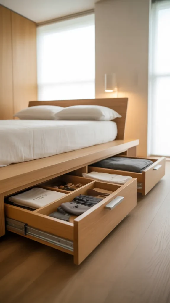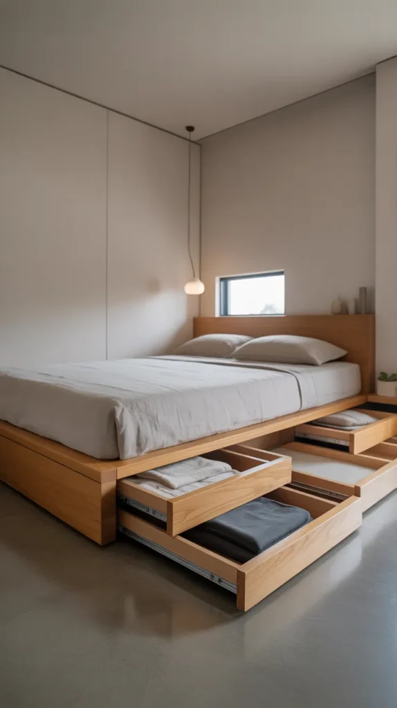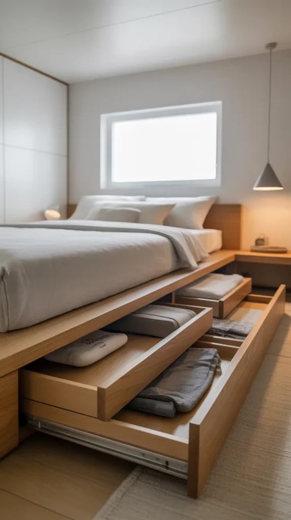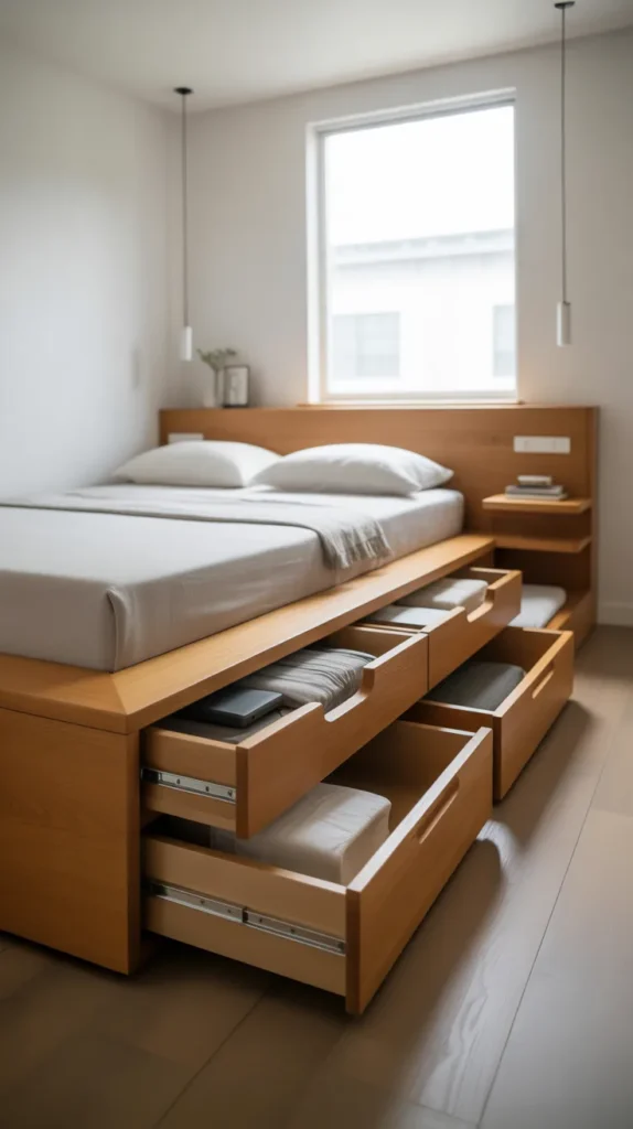 Use drawers, rolling bins, or hydraulic lift beds to store clothing, bedding, and accessories. Perfect for small house plans or compact city bedrooms.