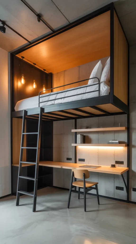 This tiny bedroom idea raises the bed, leaving space below for a desk, closet, or reading corner. Perfect for studio apartments, hostel rooms, and modern micro-homes. Add warm lighting and railing details to keep it stylish and functional.