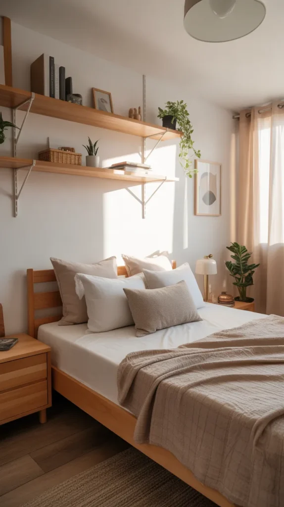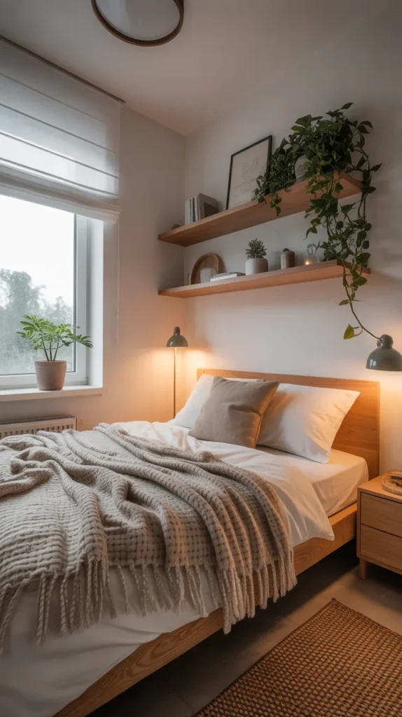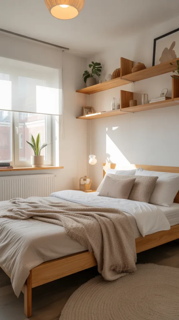 In tiny bedrooms, clutter makes the room feel even smaller. Scandinavian design solves this with a “less is more” principle. Keep the color palette light (white, beige, soft gray), use floating shelves instead of bulky cabinets, and bring warmth with soft blankets and indoor plants.
