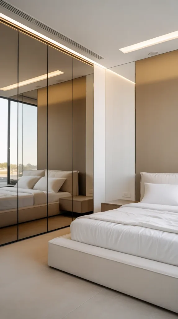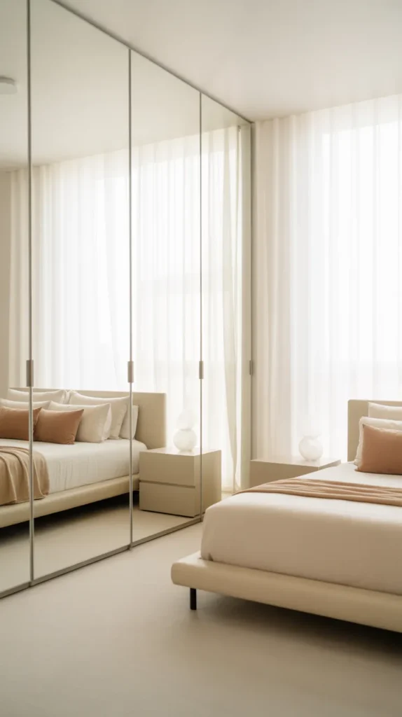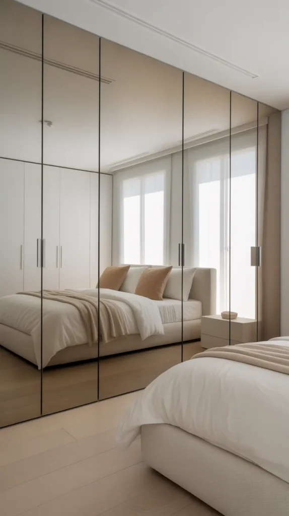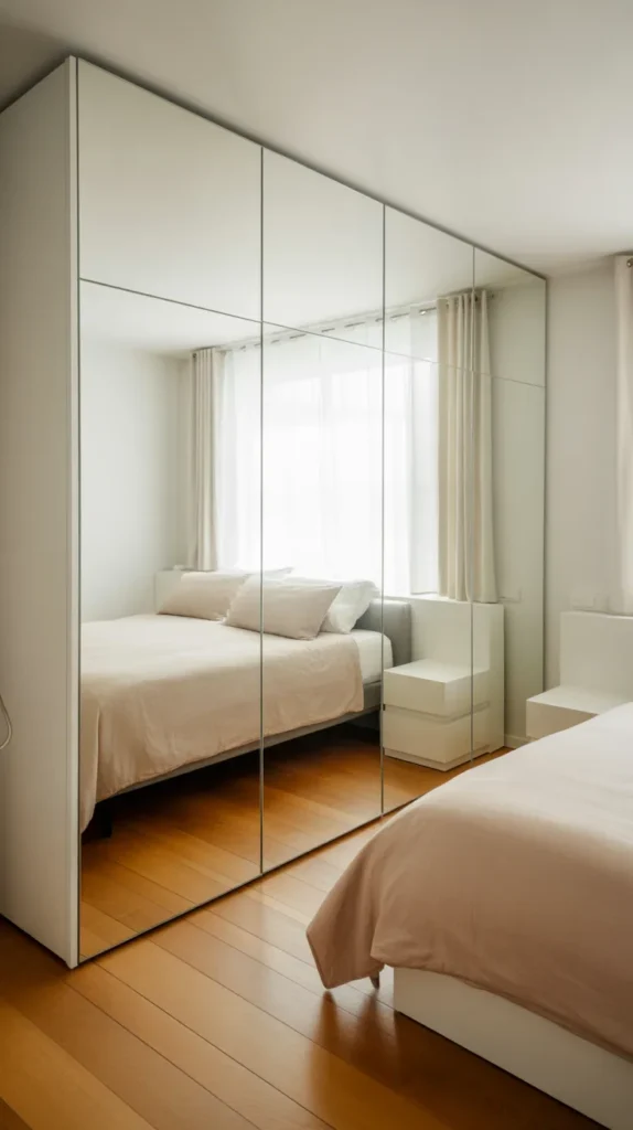Use full-mirror wardrobe doors or a large wall mirror to create depth. Pair with soft lighting and a neutral palette for the best small room makeover effect.